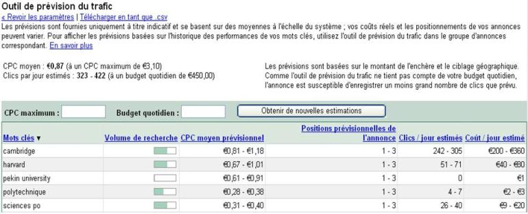 Sur Google Adwords, on peut également consulter le taux de popularité des universités, en voyant combien de clics sont estimés par jour, pour les sites contenant les mots "Harvard", "Cambridge" ou "Sciences-Po".