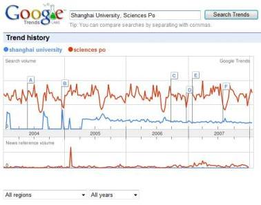 Voici les résultats pour la comparaison Shanghai University/ Sciences Po, dans le web international :