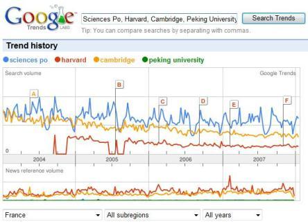 Ci-dessous, la comparaison Sciences Po, Harvard, Cambridge et Peking University dans le web francophone :
